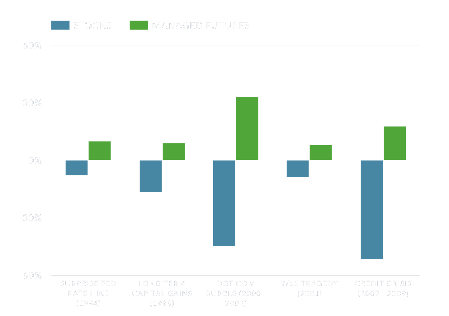Managed Futures non correlation to stock markets means there will be periods when stocks and managed futures both go up in tandem, and periods when they go down in tandem, as well as the periods where they move opposite one another. Taking a longer perspective shows that managed futures can perform in a wide range of stock market environments, including positive performance during stock rallies.